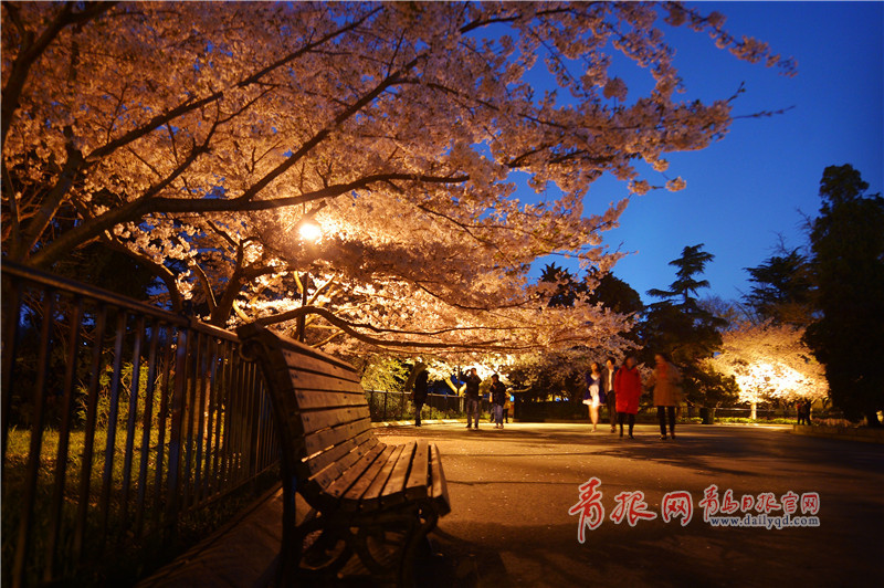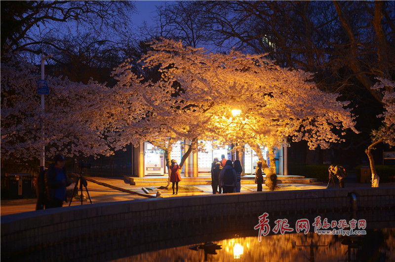 而在中山公园,暮色中的樱花变得如梦如幻,吸引了不少游客特地前来夜游赏樱。(“青岛观”摄影师 王海滨/摄)