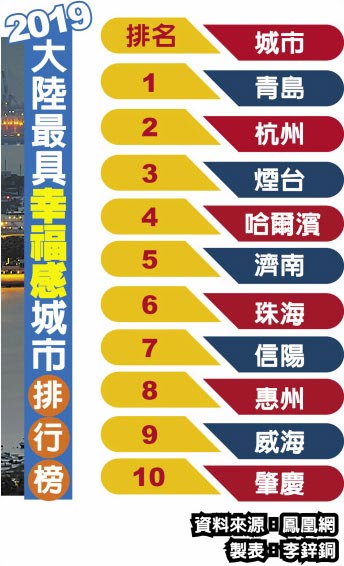 中外城市競爭力研究院日前公布2019大陸最具幸福感城市排行榜。前三名最具幸福感城市分別是青島、杭州、煙台。在最美城市和宜居城市入榜的名單中,杭州和青島等城市也名列其中。專家指出,幸福感和宜居條件息息相關,因此入榜城市常會出現「常勝軍」,但也因調查單位和調查項目不同,也會有不同結果。