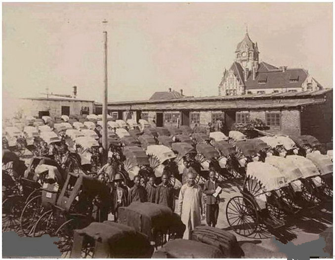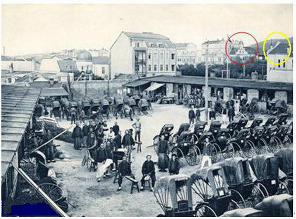 从图3的前景看,胶澳警察署的塔楼,在夕阳的照射下,其投影正好落在这个车站靠近新泰路的这趟平房房顶上,由此,可以判断,画面右侧的这条路是现在的湖北路,画面最左侧就是现在的曲阜路,这个车站东侧的那趟平房的身后就是河南路,也可以这样说,这个人力车站是由湖北路、河南路、曲阜路和新泰路合围而成。