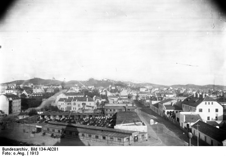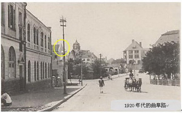 这张照片(图2)标注也是摄于1900年,对比图1和图2这两张照片,可以发现它们是一个地方,只是拍摄的角度不一样。但从图2可以看出一个明显的方位,就是照片的后景为现在湖北路和新泰路交口的青岛市公安局塔楼。从资料看,青岛市公安局在德占青岛时称胶澳警察署,建于1904年,由此而见,图2这张照片不是摄于1900年。但从这张照片完全可以判断出它位于现在的湖北路与新泰路口,前不久发现的一张老照片也印证了这一点——