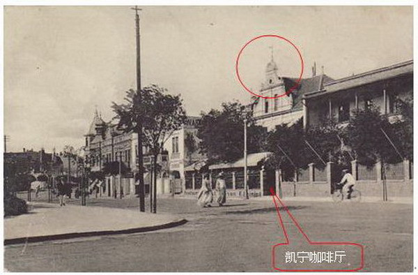 再来看图4中画黄圈的建筑,经过反复对照我所收集的一些老照片,辨认出其是原中山路上的老建筑凯宁咖啡厅,见下图(图6)——