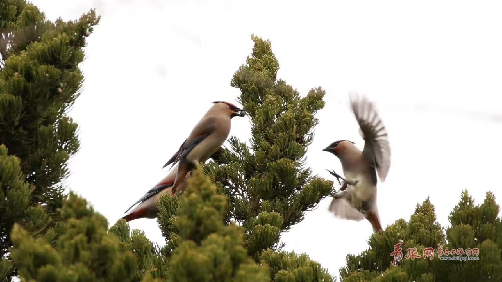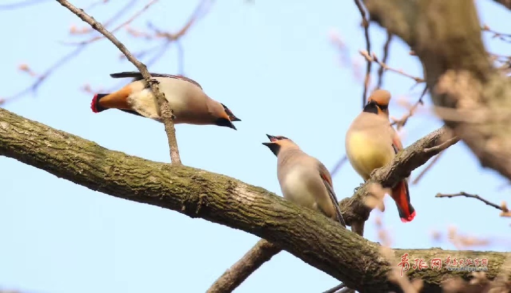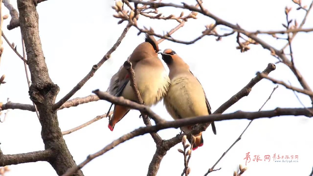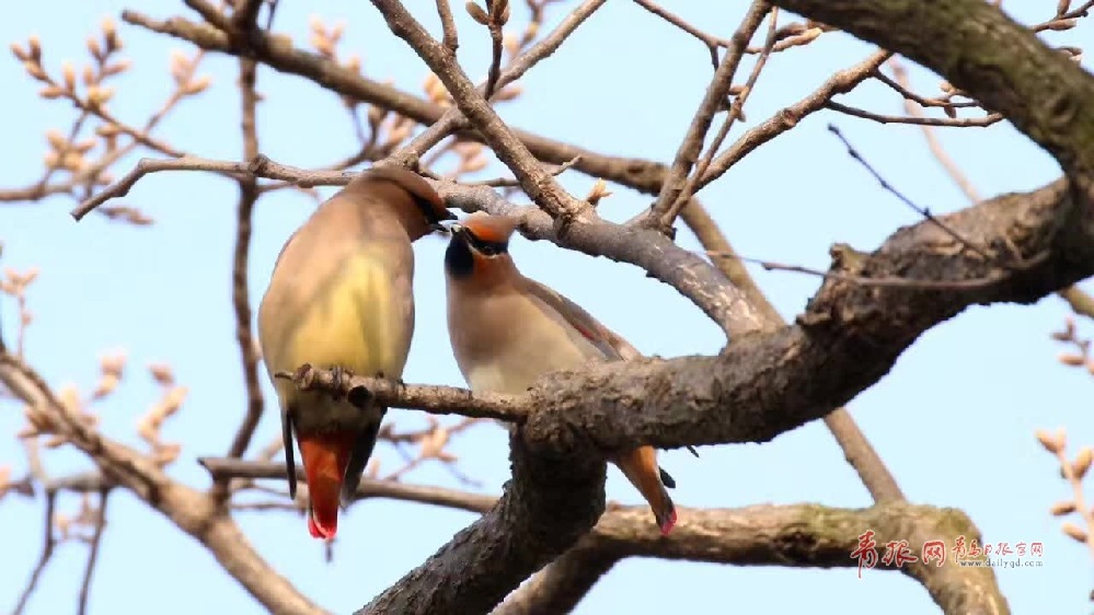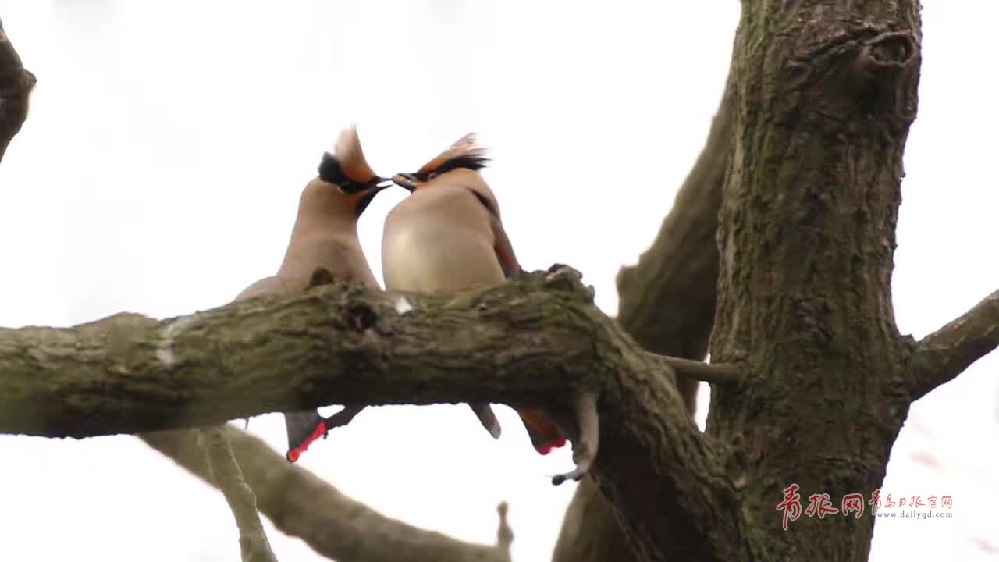 太平鸟“夫妻”枝头大秀恩爱,啄浆果互相喂食。
