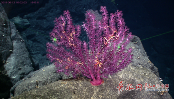 海洋所紫柳珊瑚(新种),该新种于2019年发现于西太平洋卡罗琳海山1549米水深,隶属珊瑚纲、软珊瑚目、紫柳珊瑚科,高约33厘米,呈扇状、亮紫色,寓意“紫气东来”。