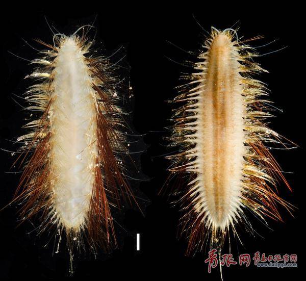 海洋所镖毛鳞虫(新种),该新种于2019年发现于卡罗琳海山888-980米的岩石底,隶属多毛纲、鳞沙蚕科、镖毛虫属,多毛类新种长6-7厘米,体覆闪亮的金色鱼叉状刚毛,犹如“黄金战甲”。
